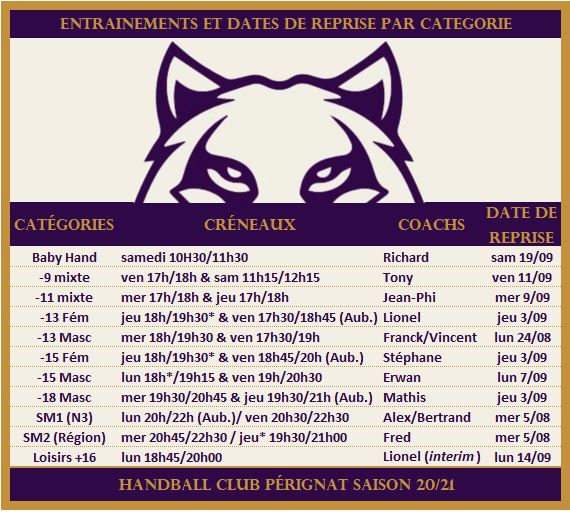 Tous les horaires sont donnés à titre indicatif et sont susceptibles de modification en fonction des effectifs par catégorie à la fin de la période d’inscription. Les parents doivent vérifier la présence du coach au gymnase et ne peuvent en aucun cas déposer les enfants sur le parking de la Halle des Sports.
